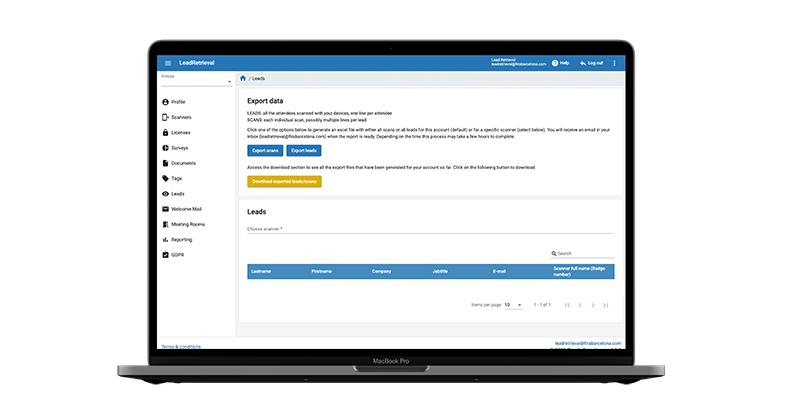 Utiliza Lead Retrieval para capturar los pases de los visitantes y obtener información detallada sobre su perfil. Consulta y actualiza sus datos de contacto: nombre, empresa, lugar de trabajo, email...